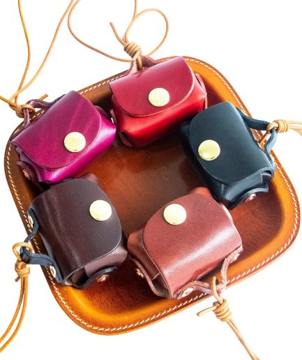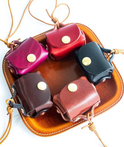 Vintage Leather Earbuds Case & Ornament – Handmade Retro Coin Pouch Style with Bronze Button & Lanyard (Red)
